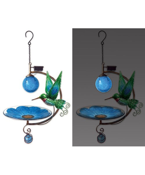 The Hummingbird Bird Feeder is a work of art that attracts all your feathered friends to your backyard or garden. This functional yet artful feeder features a full 8"" diameter glass feeding plate that is illuminated at night via the solar-powered, glass globe. Easy to hang and clean. Battery included.
