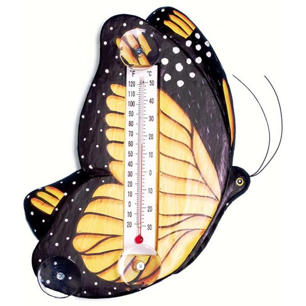 Songbird Essentials' small window thermometers are hand-carved from albesia wood. Each piece is hand-painted on both sides and coated with polyurethane to protect them from the environment. The thermometers are mercury free and read in both Fahrenheit and Celsius. They are individually carded with barcode, product information and mounting instructions on the back.