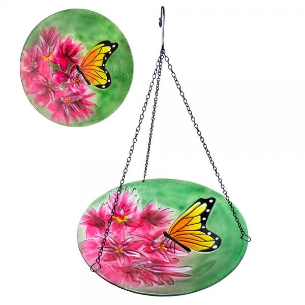 Our beautiful glass bird baths feature gorgeous, embossed designs and songbird-friendly textured bottoms at the correct depth. Quality glass makes our bath durable and easy to keep clean. Baths will stay vibrant year after year. Store during cold and inclement weather to prevent damage. Attractive enough to display indoors as a centerpiece or accent décor. 13" Glass Bath with powder coated hanging chain.